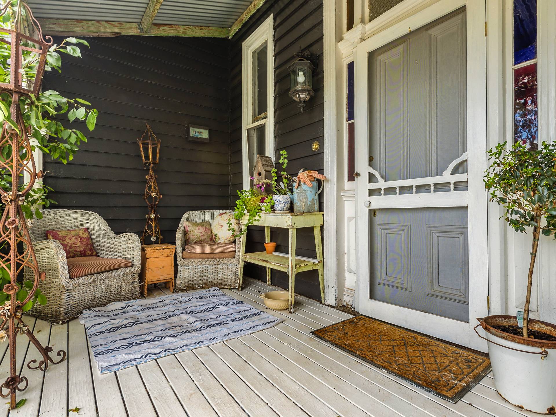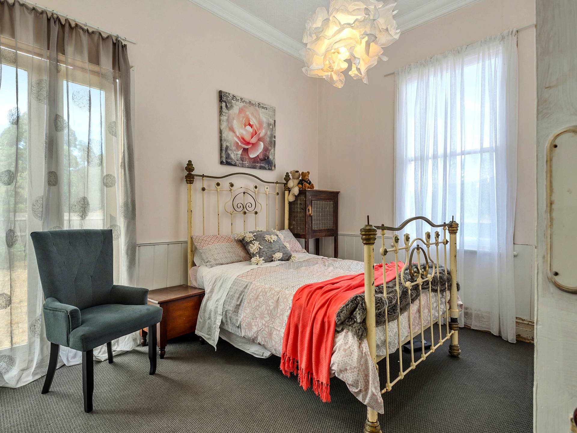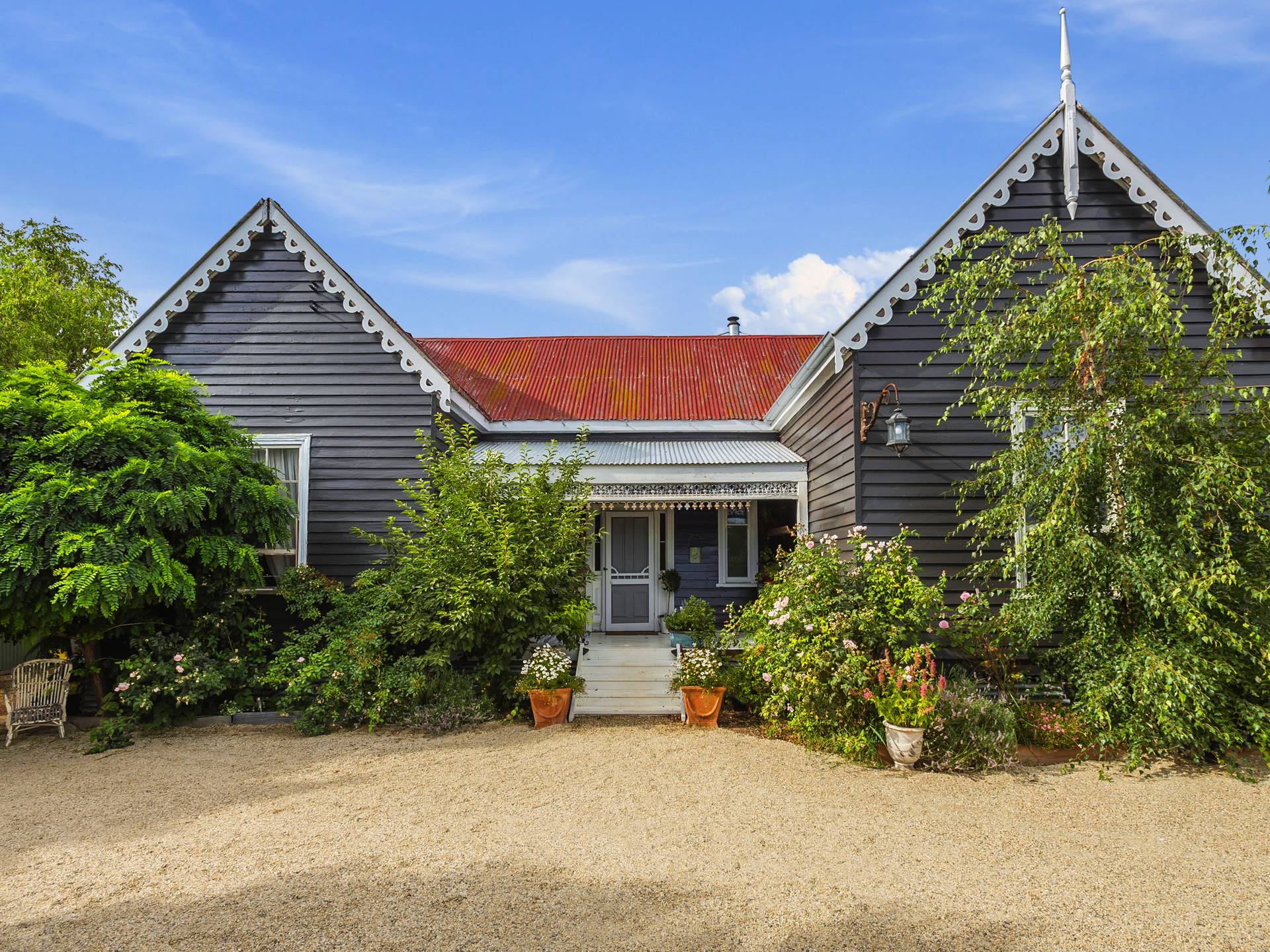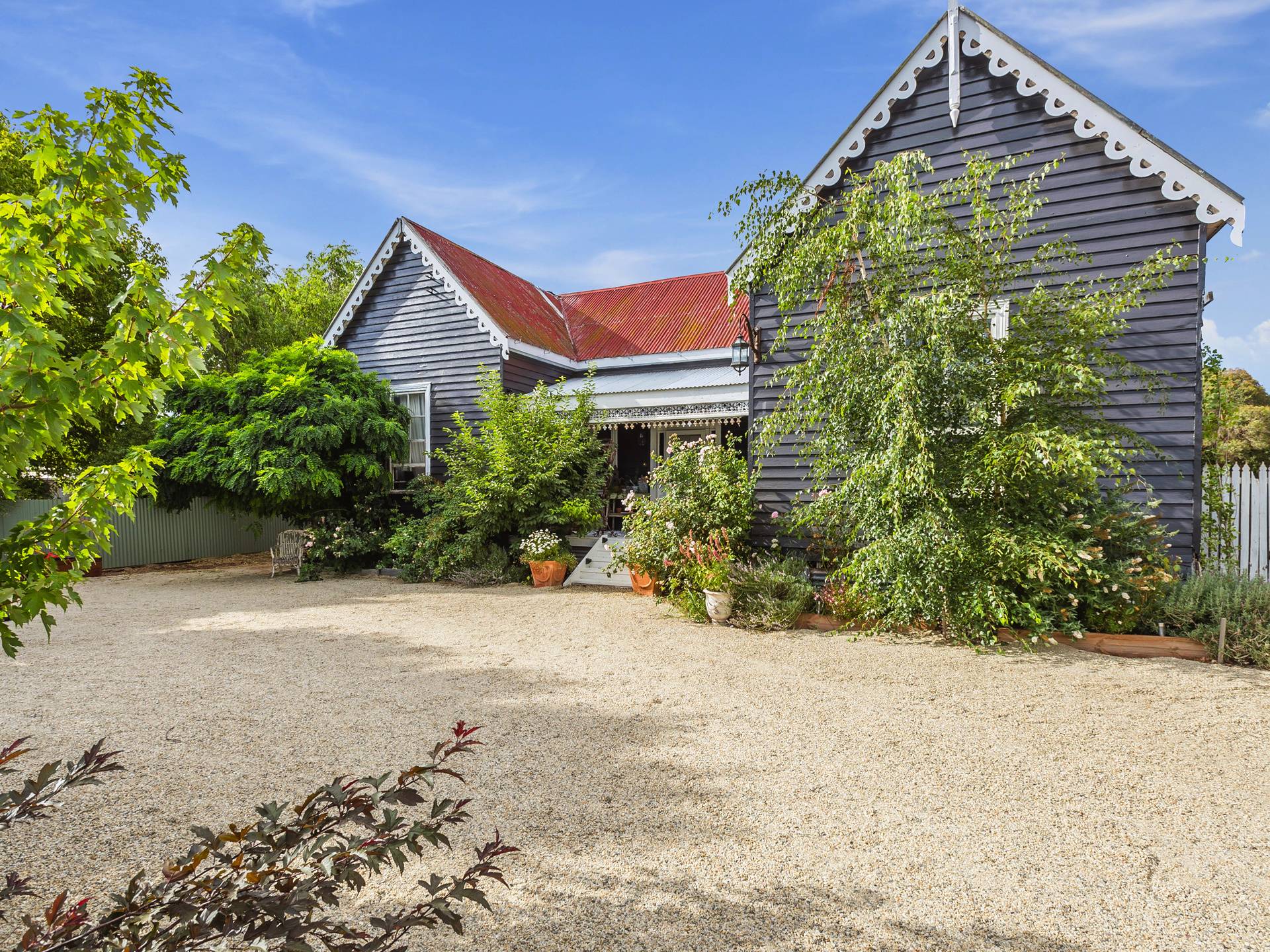Situated down a quiet, private driveway off beautiful, leafy Dunsford Street in the gorgeous village of Lancefield you will find Mortlake. Even though it has been relocated it fits perfectly into the area and looks as though it’s been here forever with its high gabled roofline, inviting front verandah and rambling cottage front garden. It has all new concrete stumps, new bearers and joists, has been rewired, replumbed and abounds with character, style and charm. It has high pressed metal ceilings, timber lining boards, dado rails with painted timber beneath, deeply patinated original timber floors and large rooms all bathed in natural light. There is a sense of space, lightness and charm throughout and in all the 3 double bedrooms plus the bathroom retains good form and function, marrying character with a modern twist.