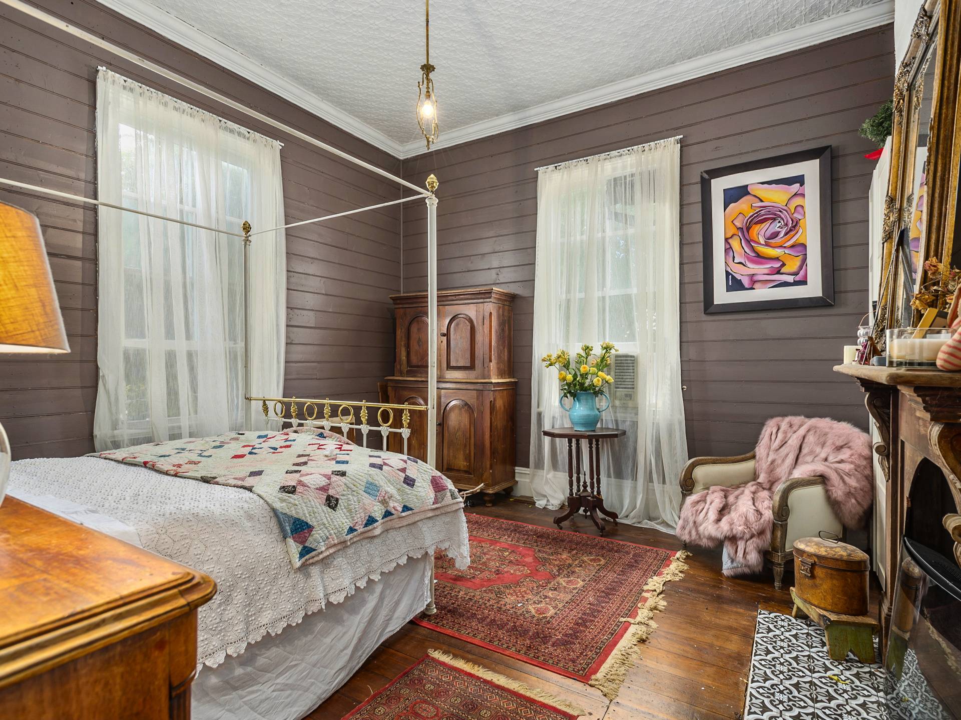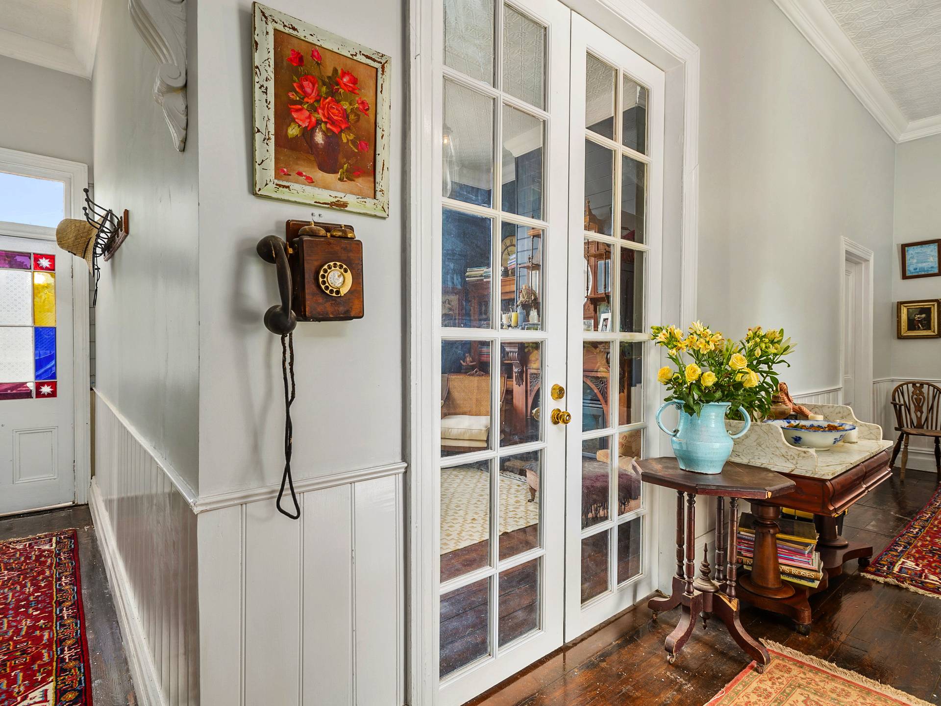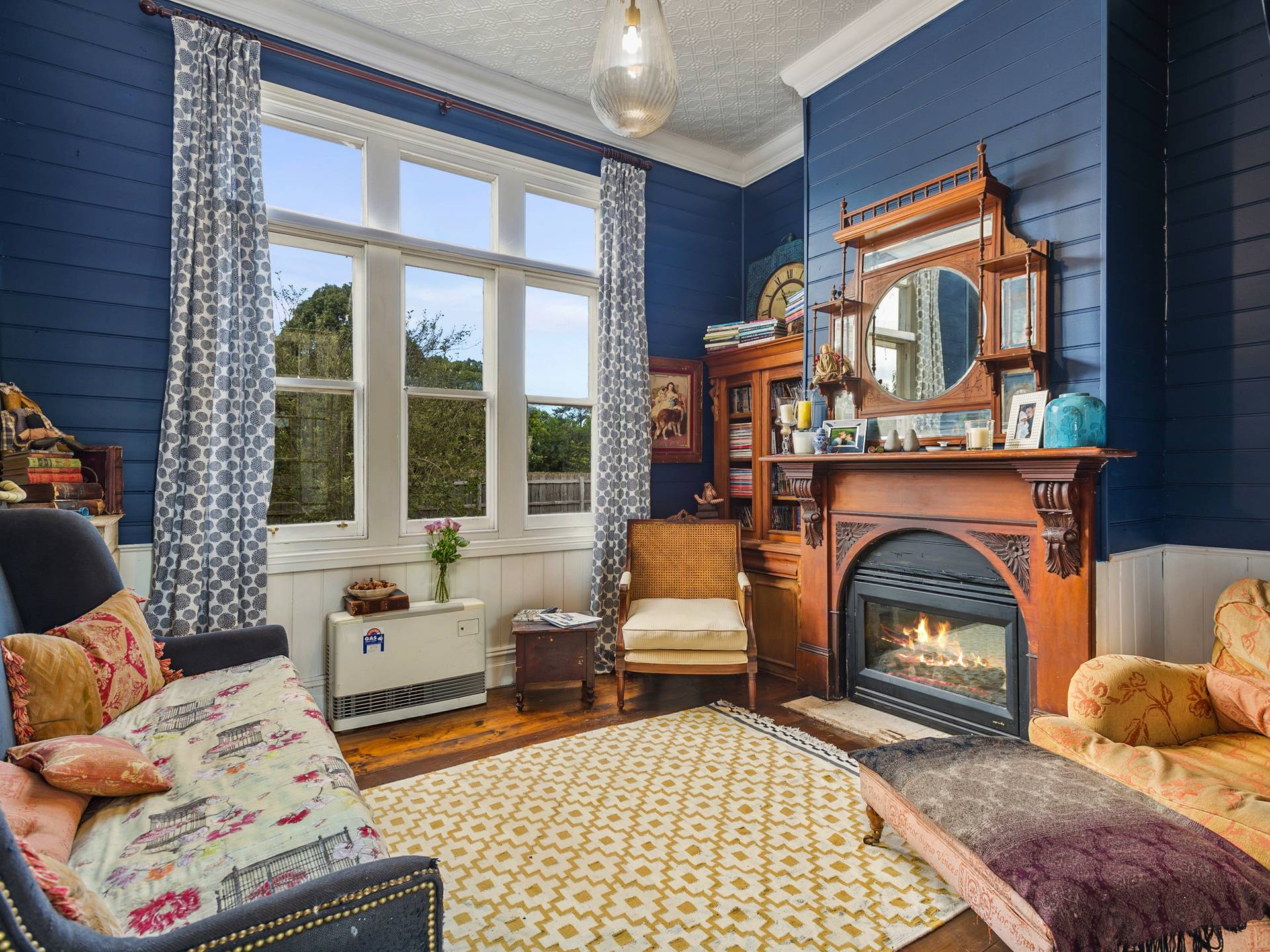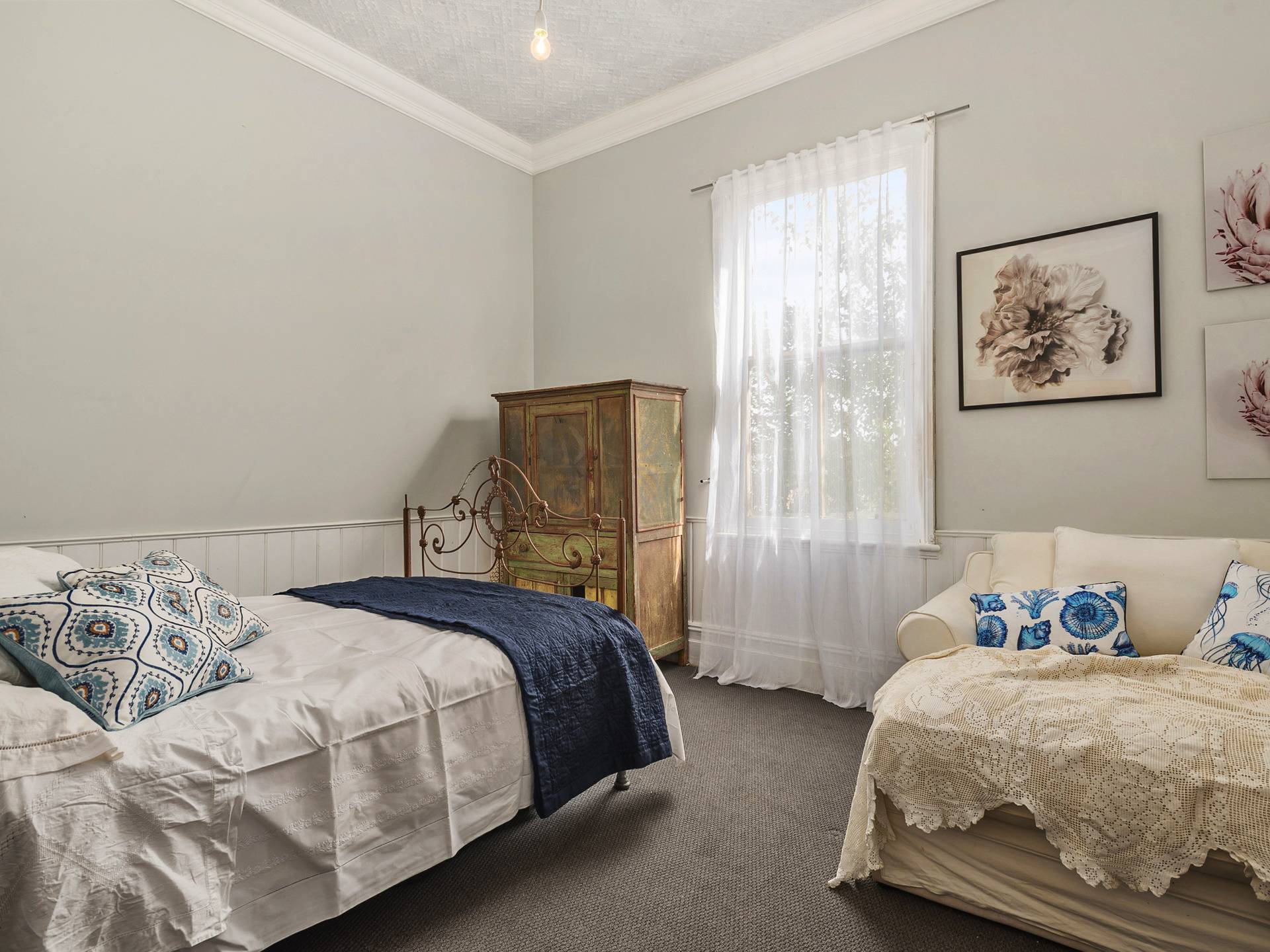 Situated down a quiet, private driveway off beautiful, leafy Dunsford Street in the gorgeous village of Lancefield you will find Mortlake. Even though it has been relocated it fits perfectly into the area and looks as though it’s been here forever with its high gabled roofline, inviting front verandah and rambling cottage front garden. It has all new concrete stumps, new bearers and joists, has been rewired, replumbed and abounds with character, style and charm. It has high pressed metal ceilings, timber lining boards, dado rails with painted timber beneath, deeply patinated original timber floors and large rooms all bathed in natural light. There is a sense of space, lightness and charm throughout and in all the 3 double bedrooms plus the bathroom retains good form and function, marrying character with a modern twist.