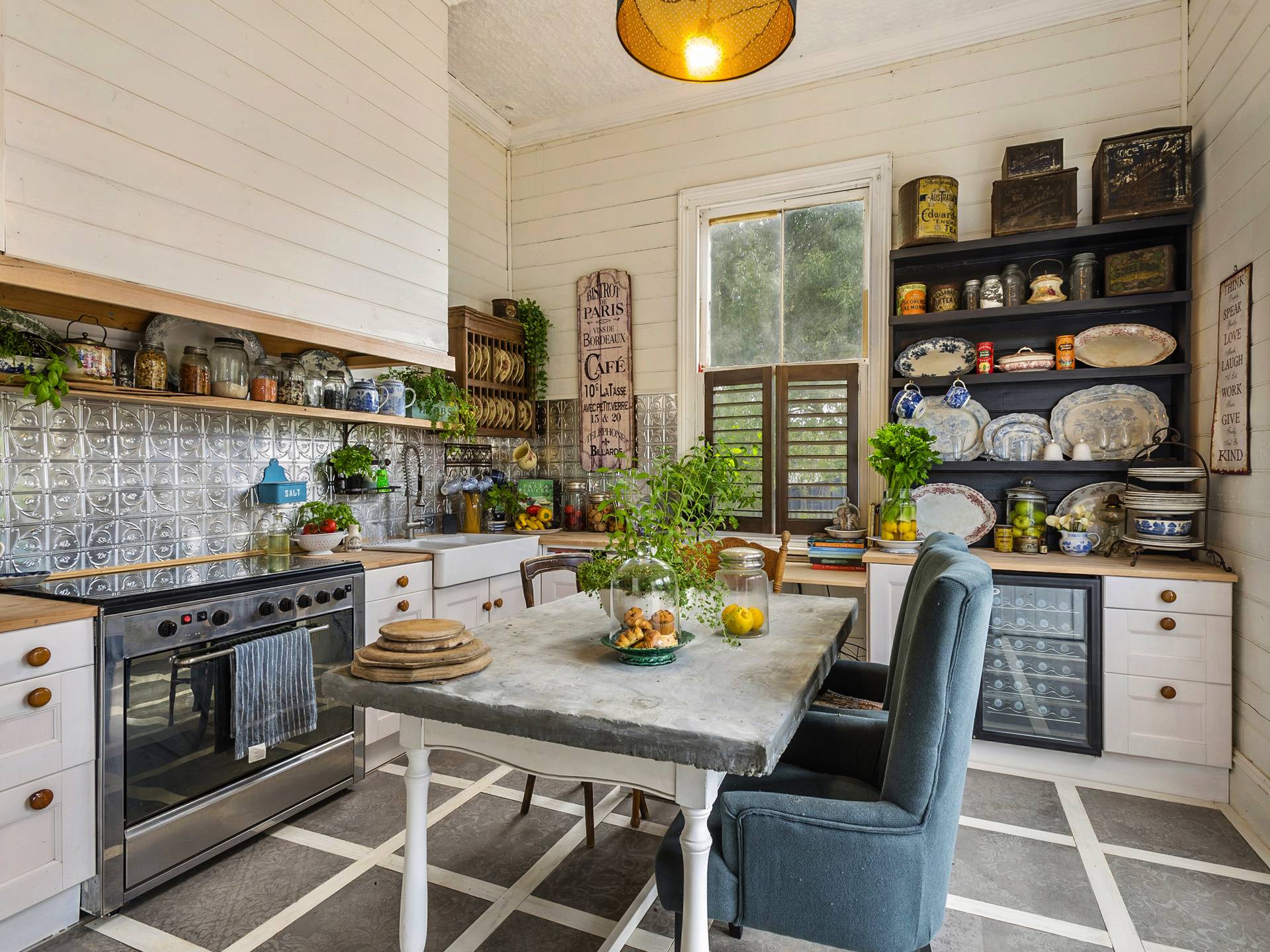 The country kitchen is filled with the old and the new with a stainless steel dishwasher, built-in wine fridge plus a double porcelain sink, 5 burner 900 mm stainless steel stove, pressed metal splash-backs to name a few features. The double French doors lead out to the rear garden which is waiting for the right person to complete the garden, add the planters, a few veggies and perhaps some chooks. The area is compact but large enough to add the country feel without being a slave to the garden.