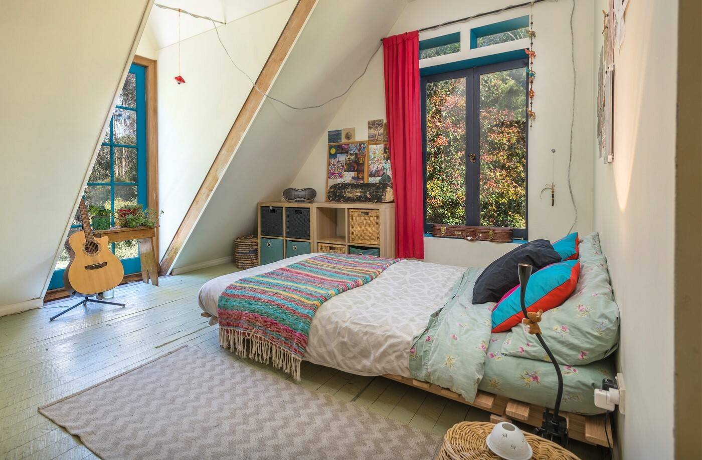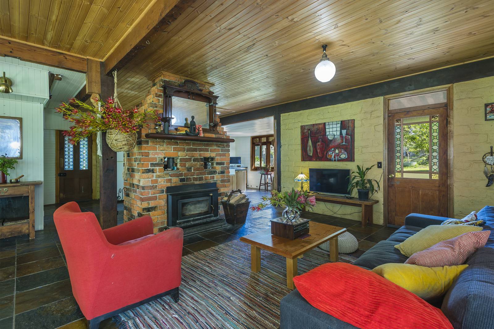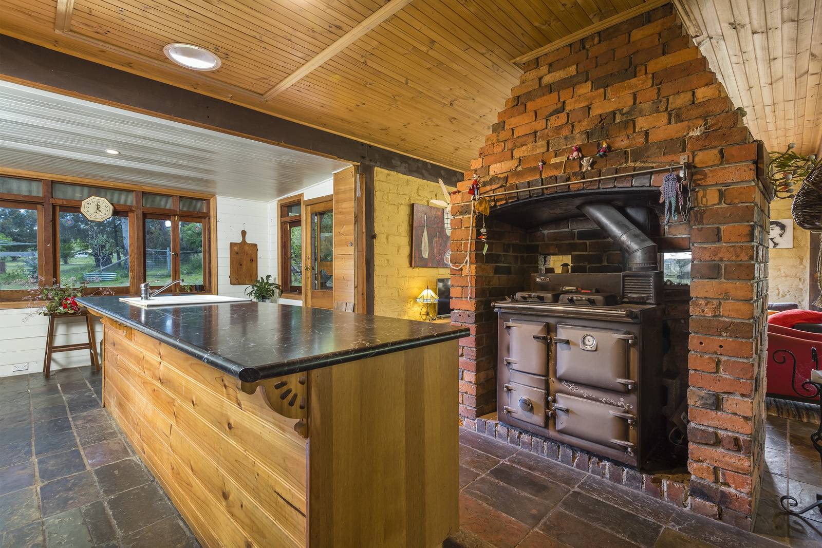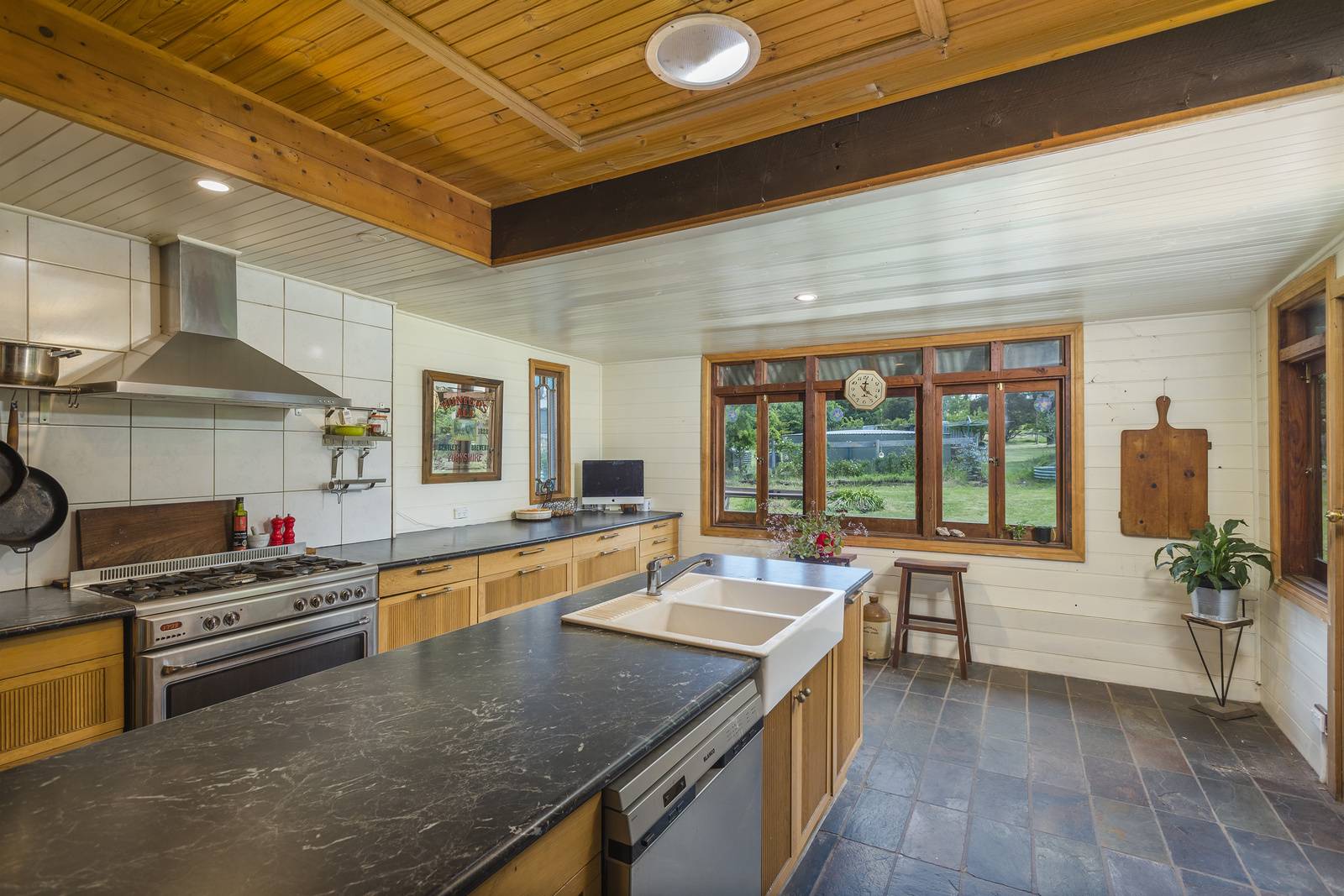 Enjoy open plan dining and lounge with cosy wood heating and garden and lake vistas from every window. The central kitchen is a cook’s delight with electric and gas cooking, dishwasher and ample benchtops for all your family celebrations and entertaining. The AGA wood burning stove is fantastic for baking and slow Sunday roasts together.