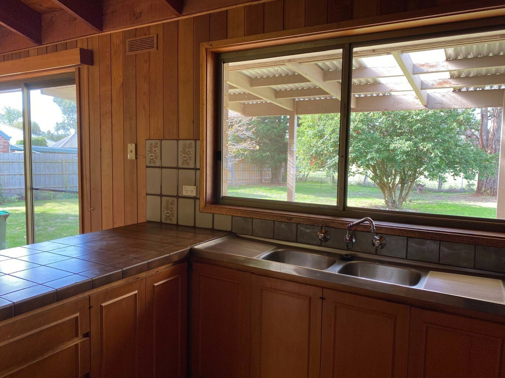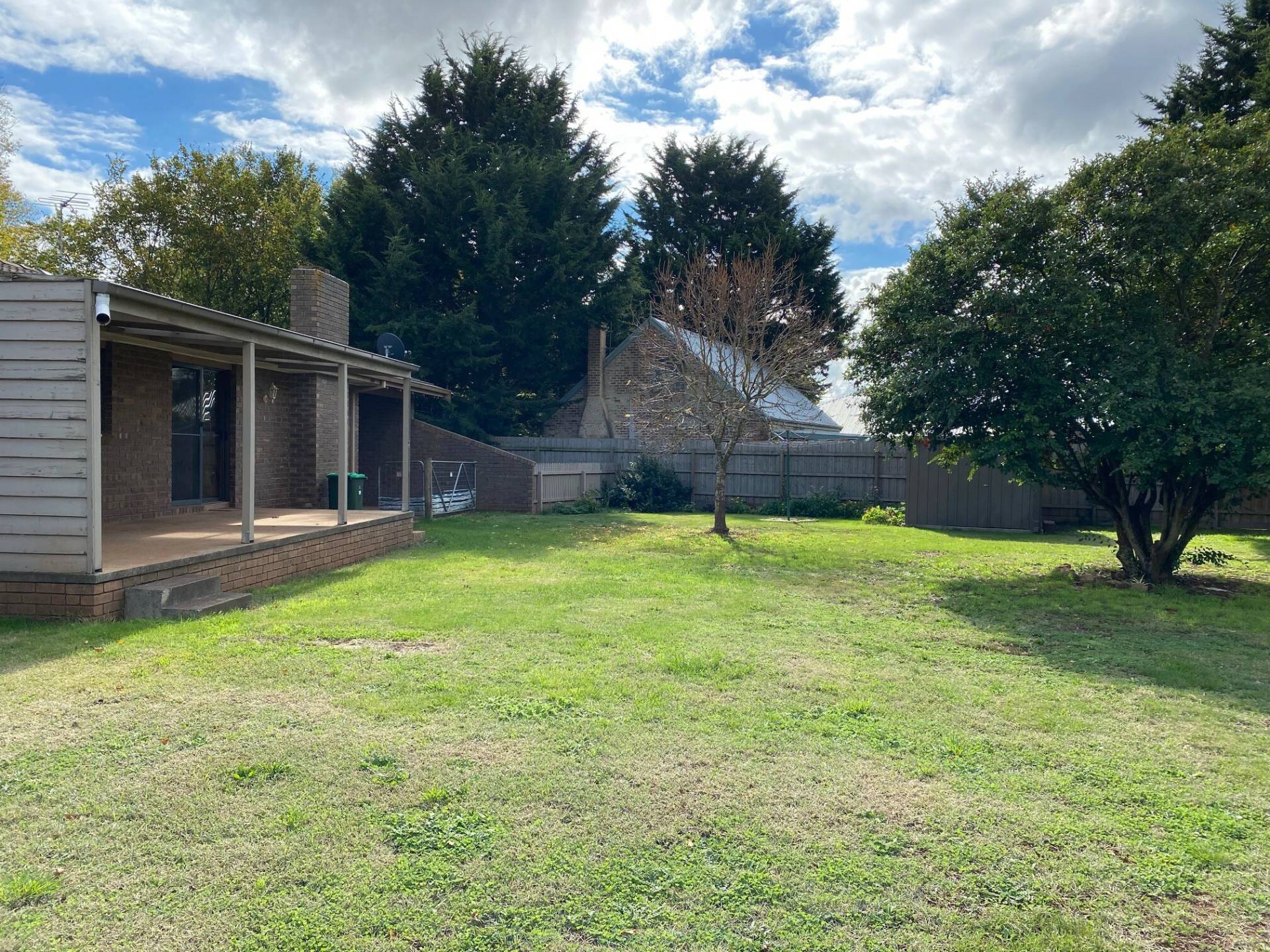 Private back porch overlooking large secure rear yard with garden shed and established trees.