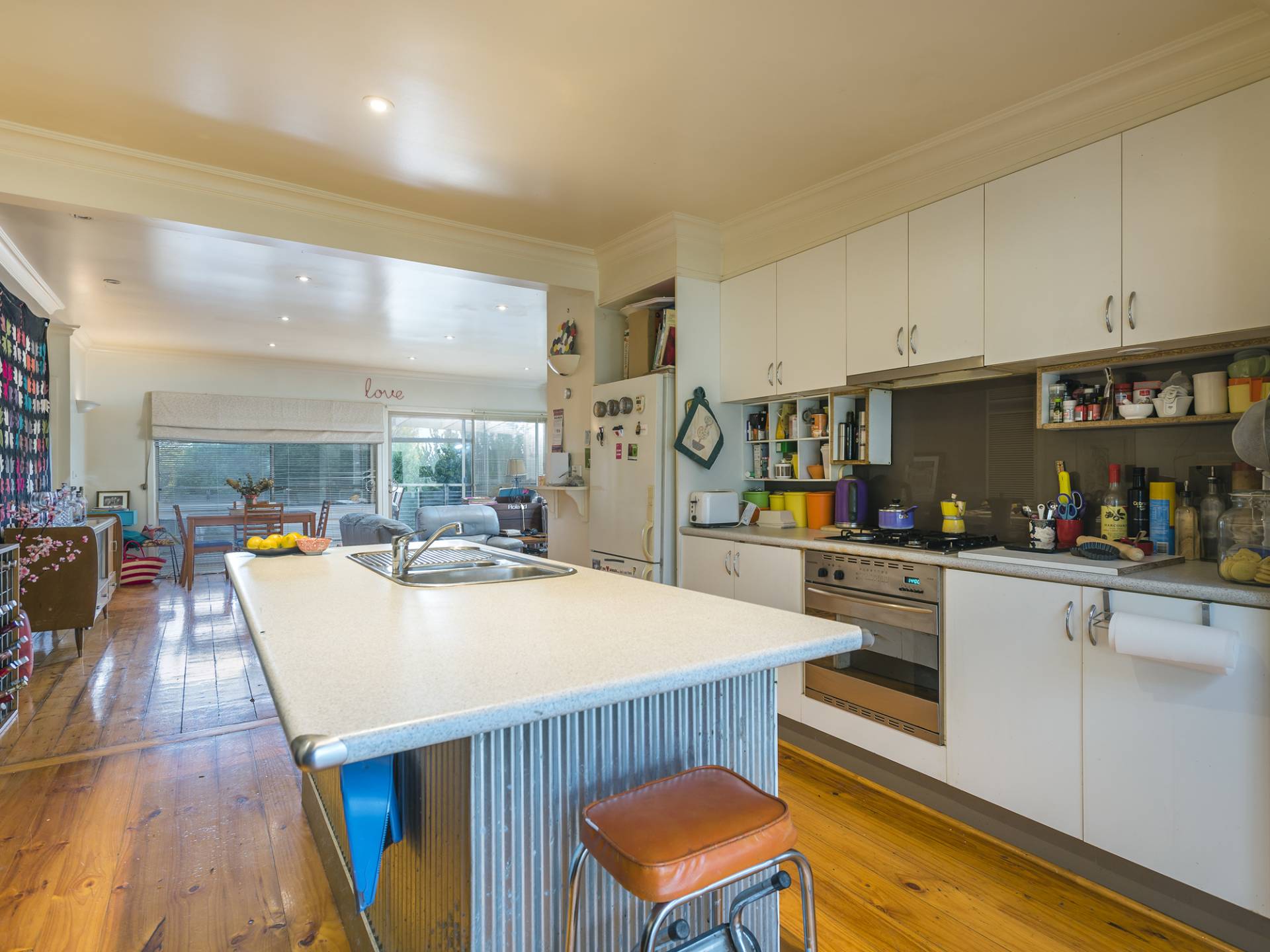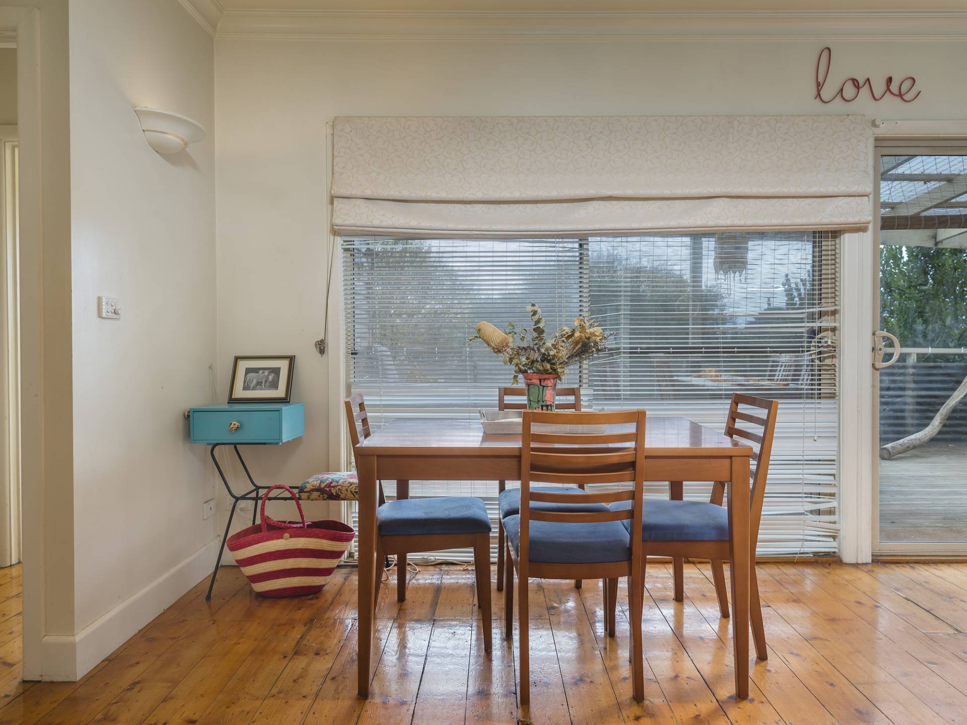 Open plan kitchen, dining and lounge area with beautiful original polished floorboards throughout and opening to enclosed front veranda with views towards the Cobaw Ranges and Mount William. There’s a cosy wood heater, gas wall heater plus a reverse cycle air conditioner and under-floor insulation.
