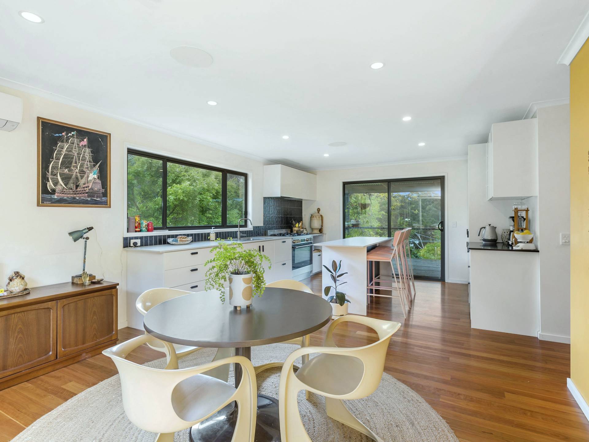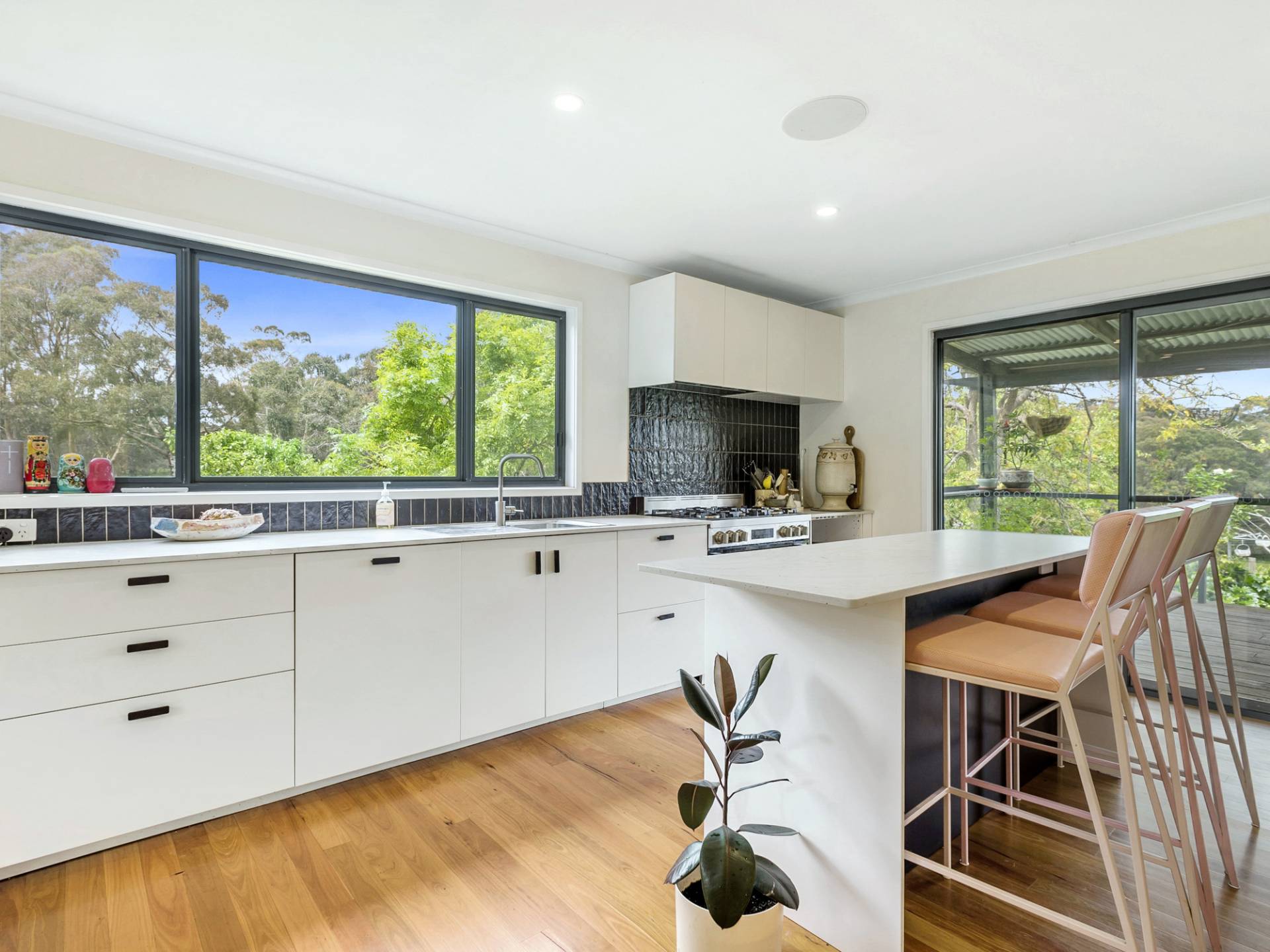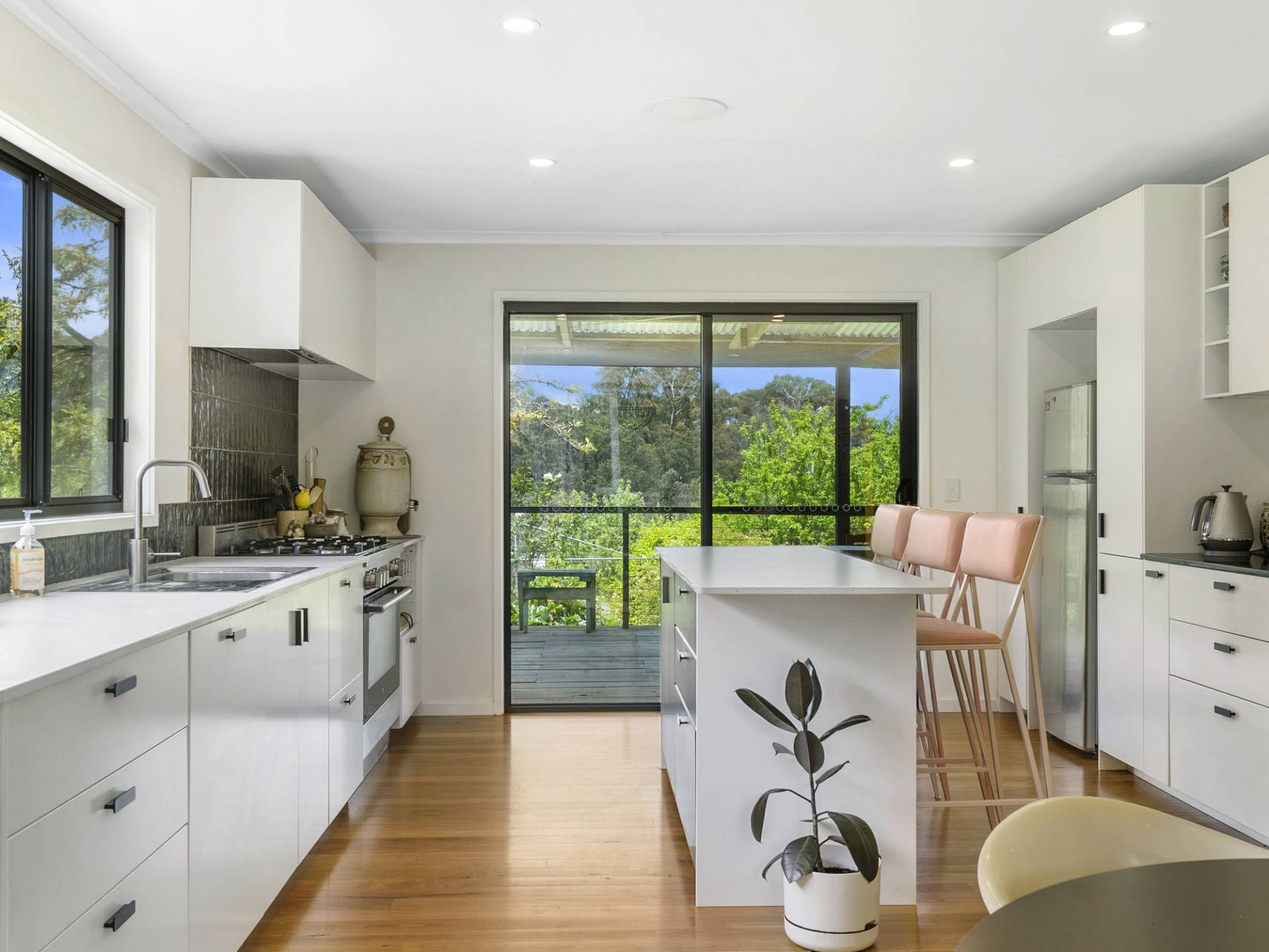There are 4 bedrooms, main with ensuite, updated family bathroom and a generous lounge and living area with cosy wood heater. The kitchen/meals area is light-filled with north-facing windows complete with reverse cycle air conditioner for chillier mornings. The recently updated kitchen includes convenient central island, stone benchtops, soft-close drawers and cabinets, large 5 gas burner cooktop and oven, double-glazed picture window with relaxing garden views and sliding doors to rear deck area for balmy summer dinners and entertaining friends and family.
