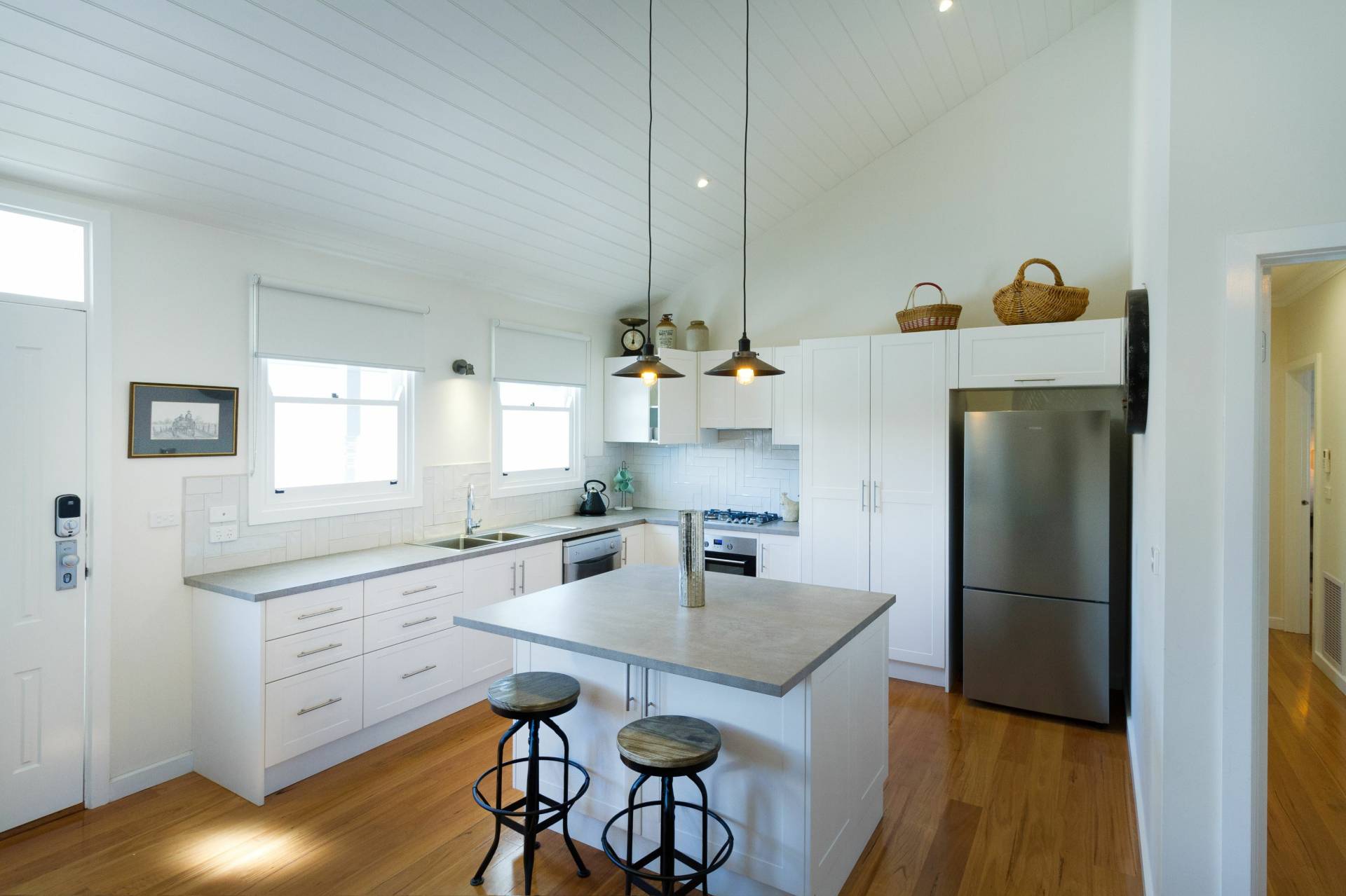 This well-appointed 2 bedroom home includes cathedral ceilings in open plan kitchen, dining and living areas leading to private rear deck space with tasteful, low maintenance gardens. Contemporary kitchen with gas cooktop, dishwasher, concrete-look benchtops and option for matching refrigerator to remain. Lounge and dining with lots of natural light, ducted gas heating, reverse cycle air conditioner and beautiful hardwood floors.