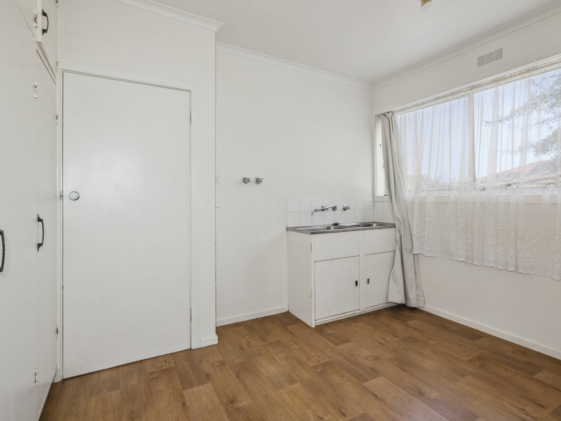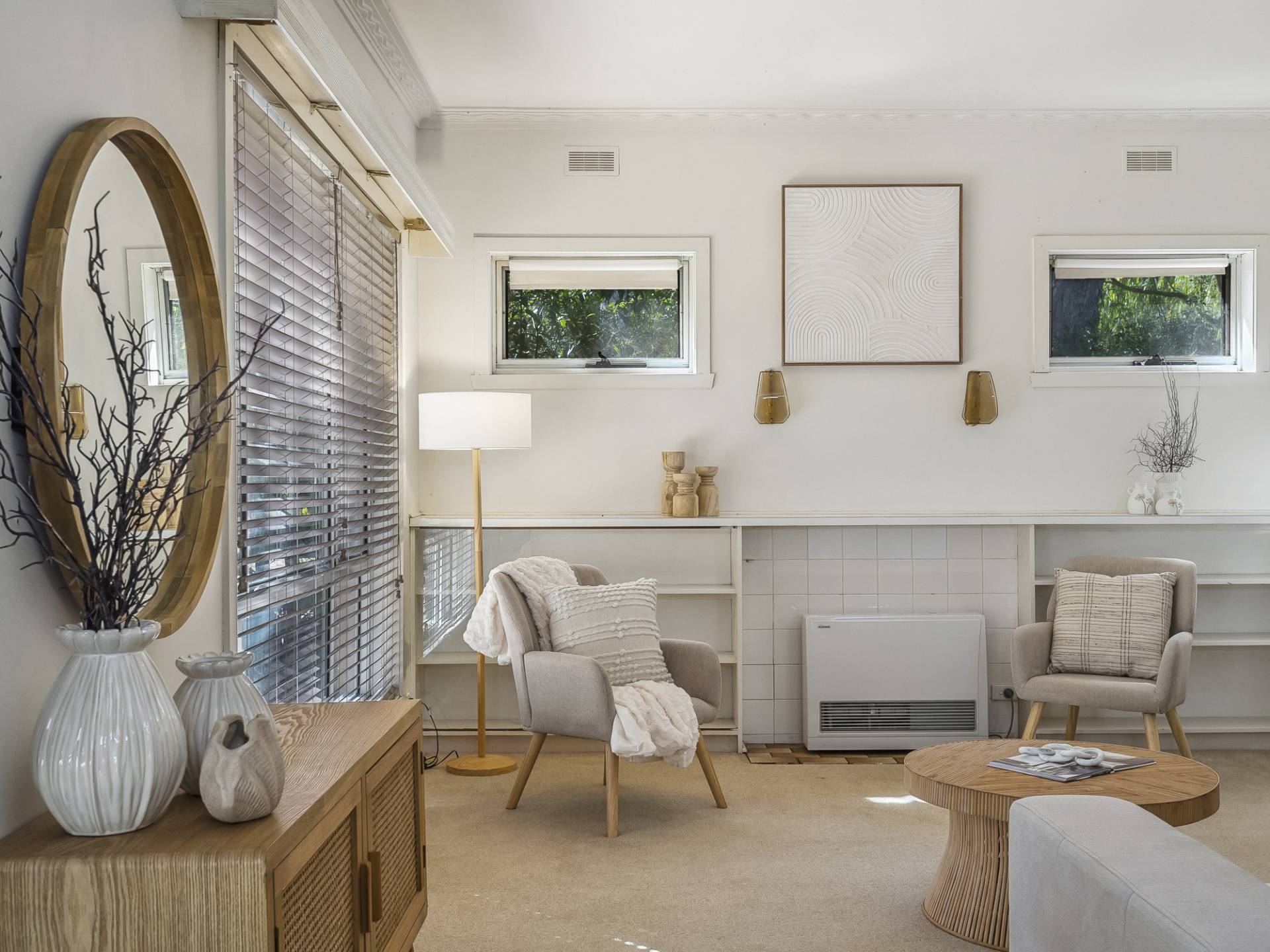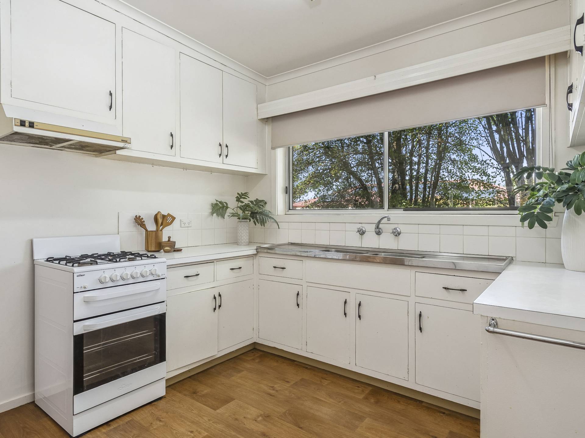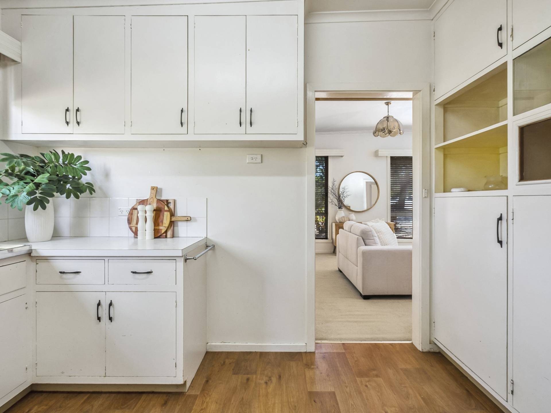 With large picture windows the open plan living dining at the front of the home is bright and functional with some trendy vintage features and a filtered streetscape outlook. The adjacent original kitchen offers ample storage and gas cooktop and is both practical and serviceable.