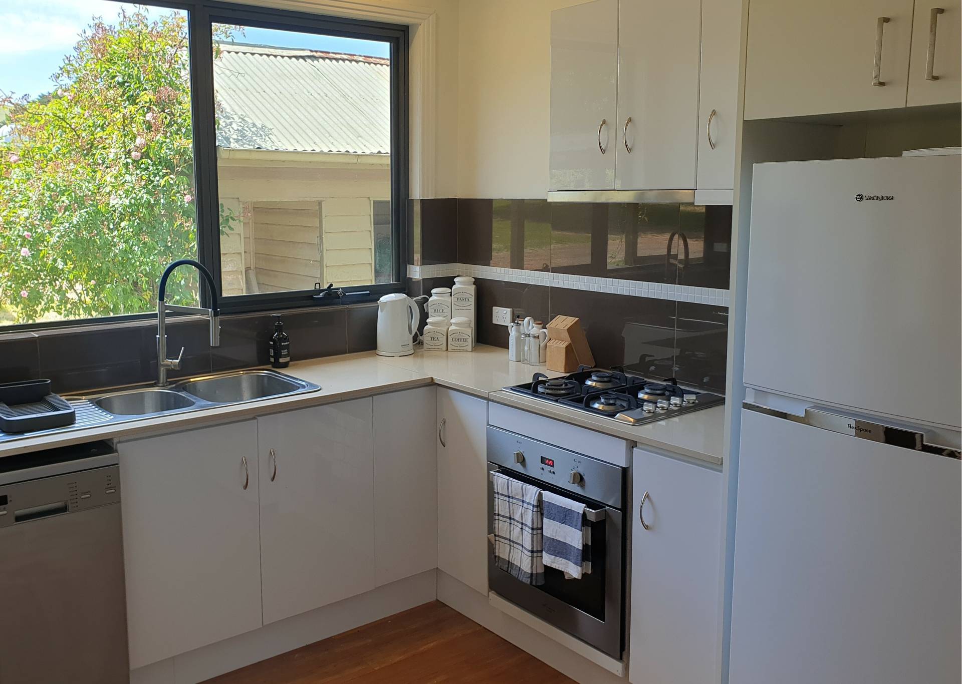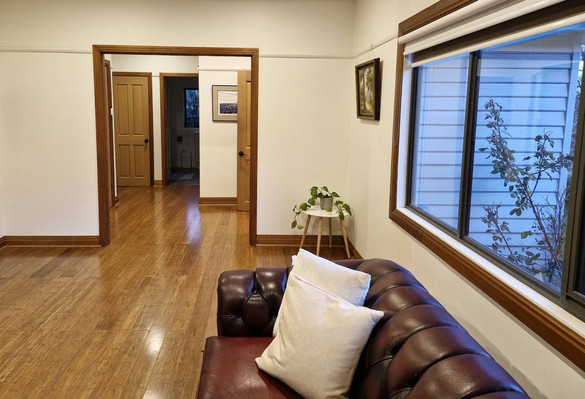 The property provides two generous carpeted bedrooms with additional study/reading nook. Light-filled open plan living and dining areas with cosy wood heater and reverse cycle split system for year-round comfort. Modern kitchen with gas and electric cooking, dishwasher and good storage options.